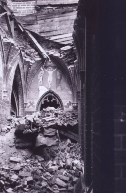 Polichromia, mimo koszmarnych zniszczeń dachu nad krużgankiem północnym zachowana w dobrym stanie – prawdopodobnie rok 1947